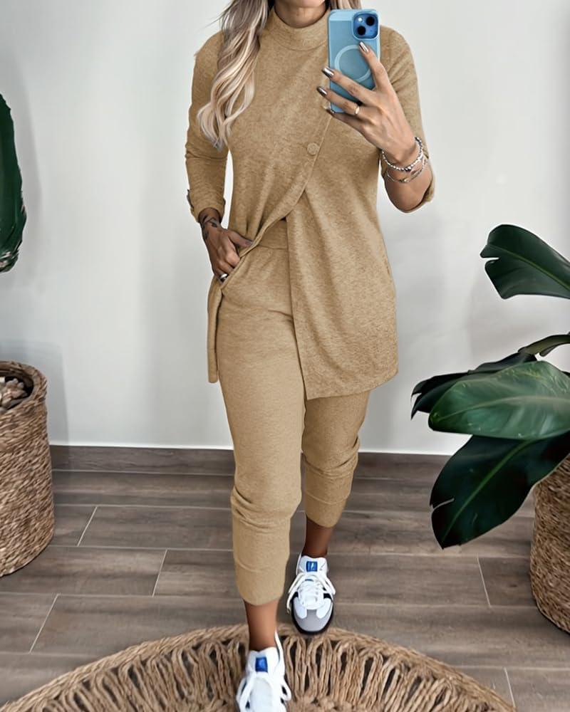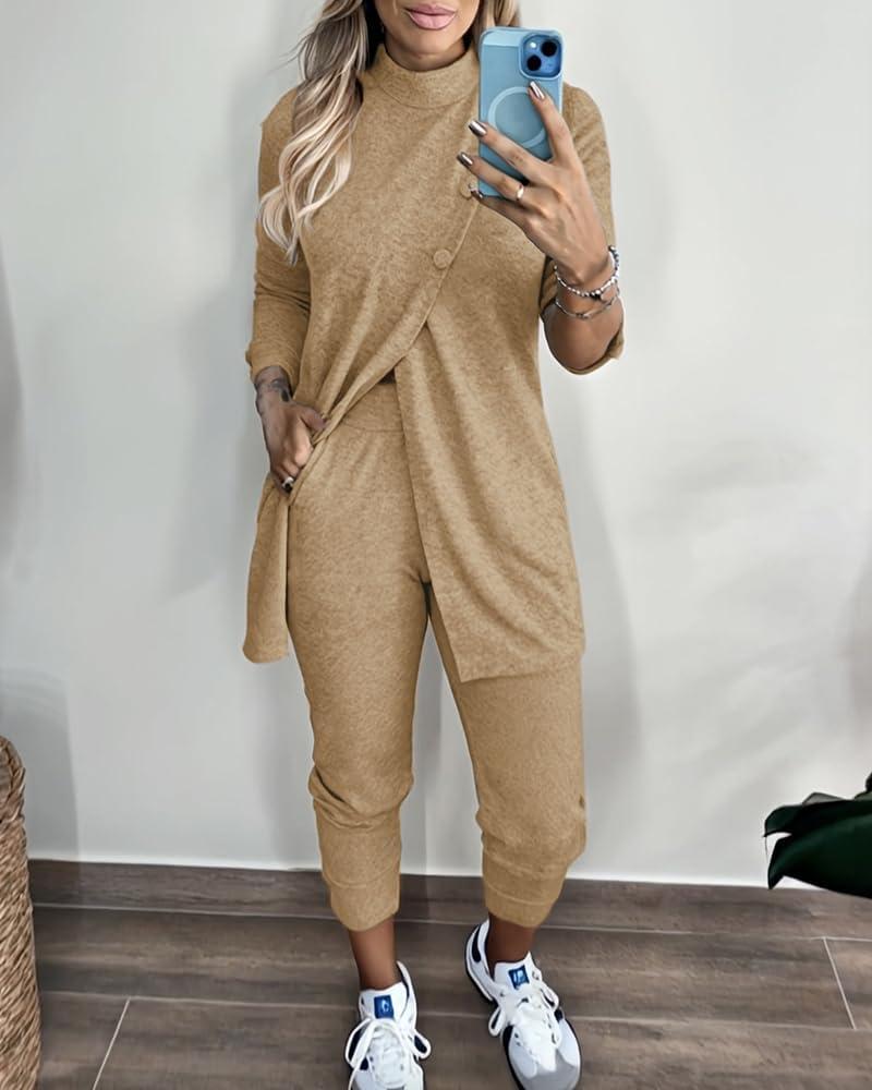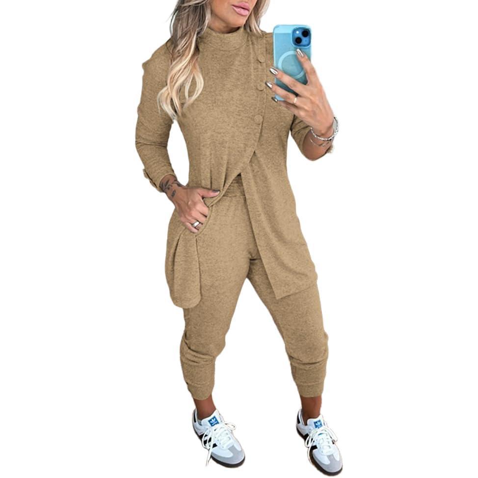 CHICME 2 Piece Long Sleeve Lounge Outfits for Women 2025 Mock Neck Decorative Button Slit Top and Stretchy Cuffed Pants Set(Khaki)