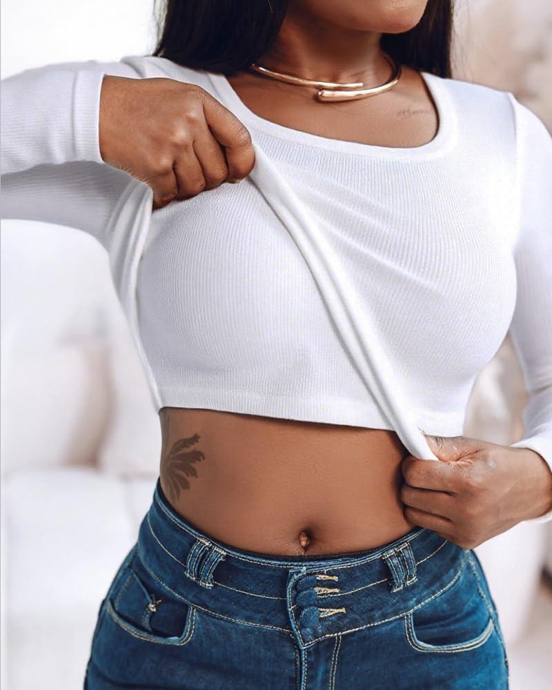 CHICME Women Seamless Built-in Bra Long Sleeve Shirts 2025 U Neck Knit T-Shirts Basic Tops Fall Outfits(A-white)