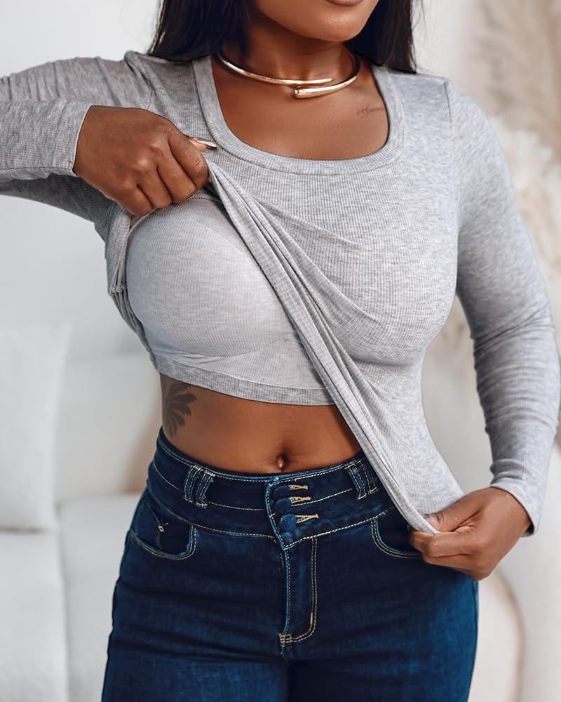 CHICME Women Seamless Built-in Bra Long Sleeve Shirts 2025 U Neck Knit T-Shirts Basic Tops Fall Outfits(E-gray)