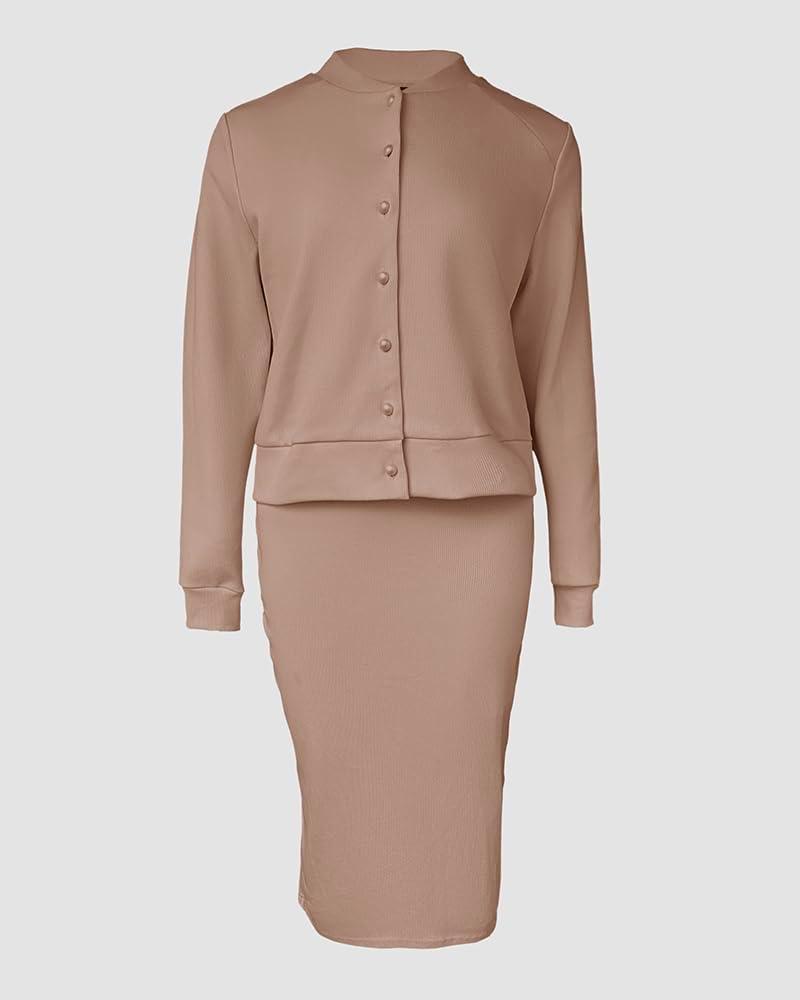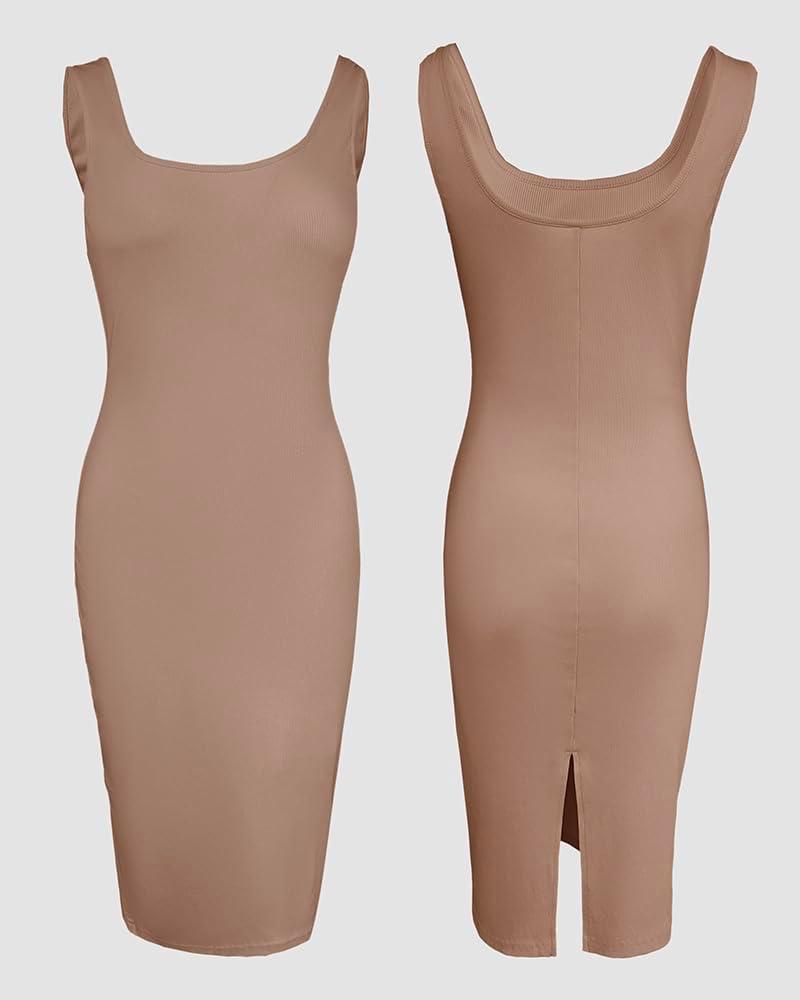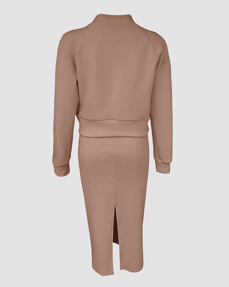 CHICME Womens 2 Piece Casual Outfit 2025 Square Neckline Sleeveless Bodycon Midi Dress with Back Slit and Bomber Jacket Set(Khaki)