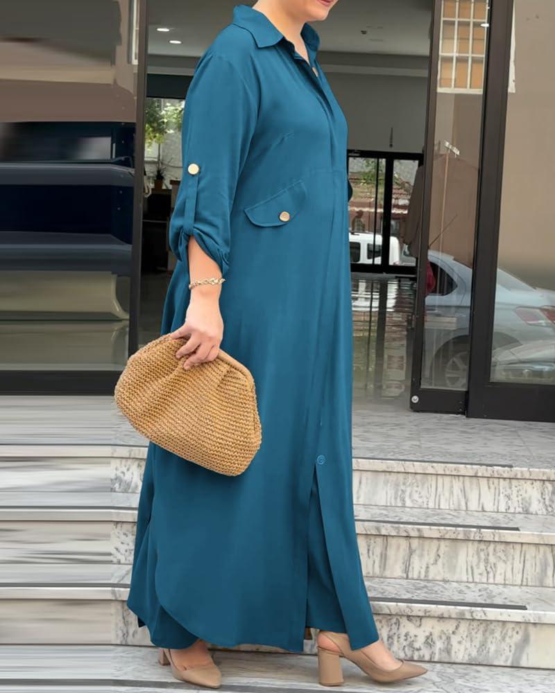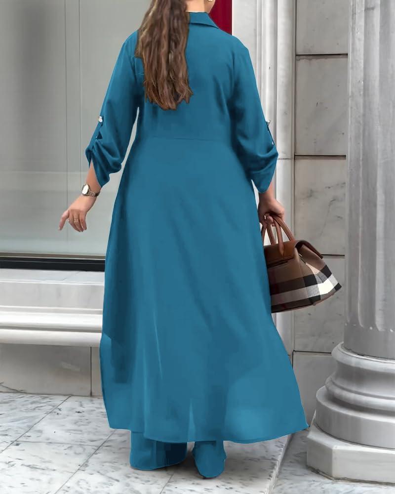 CHICME Womens 2 Piece Casual Outfits 2025 Long Sleeve Button Down Longline Shirt and Wide Leg Pants Set Lounge Set(Turquoise Blue)