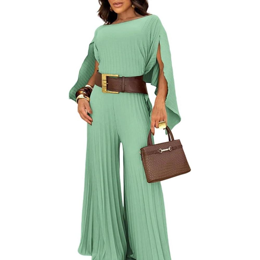 CHICME Women's 2 Piece Pleated Outfit Set Stylish Asymmetrical One Shoulder Top & High Waist Wide Leg Pants(Light Green)