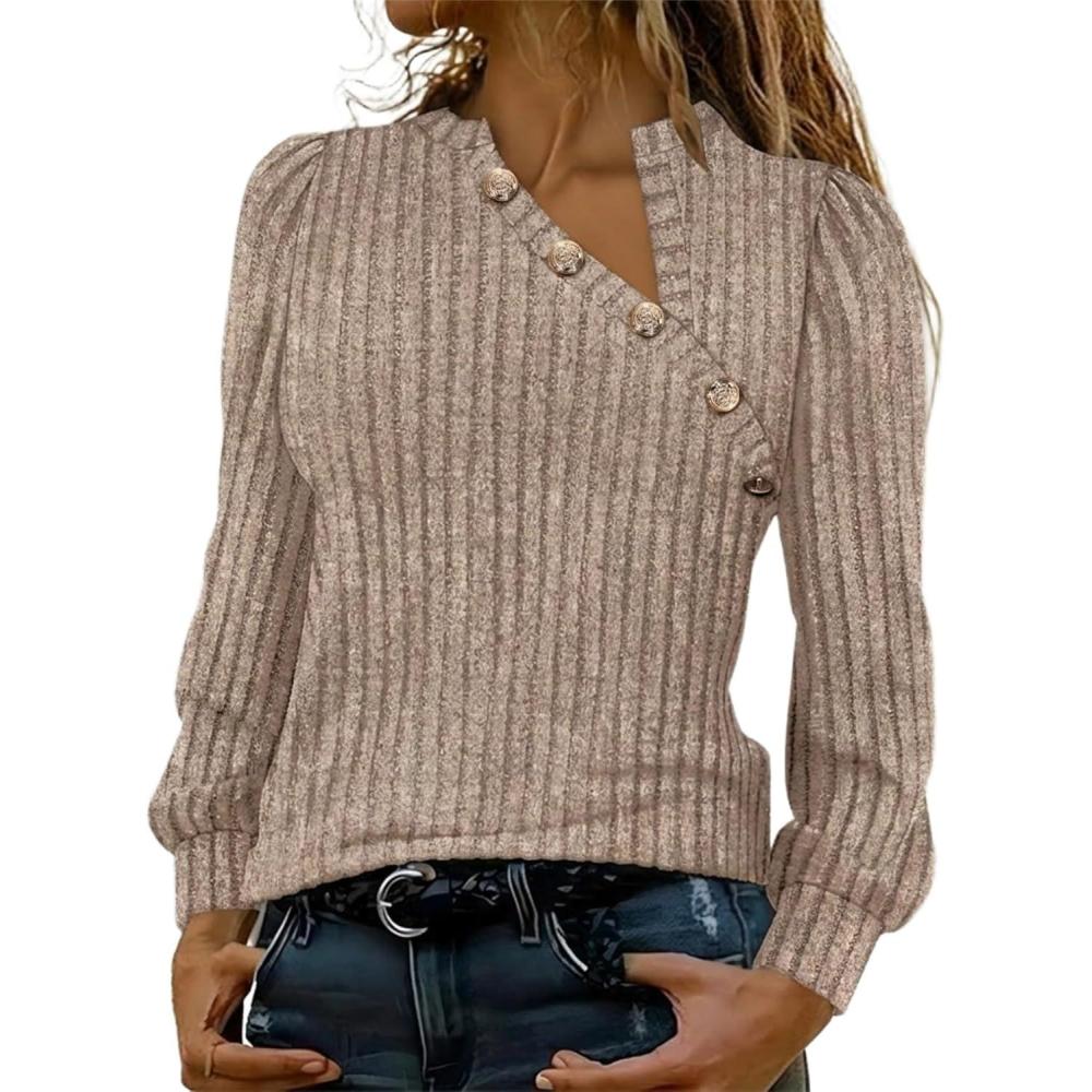 CHICME Women’s Casual Ribbed Knit Long Sleeve Top 2026 Asymmetric V Neck Blouse with Decorative Buttons(Coffee)