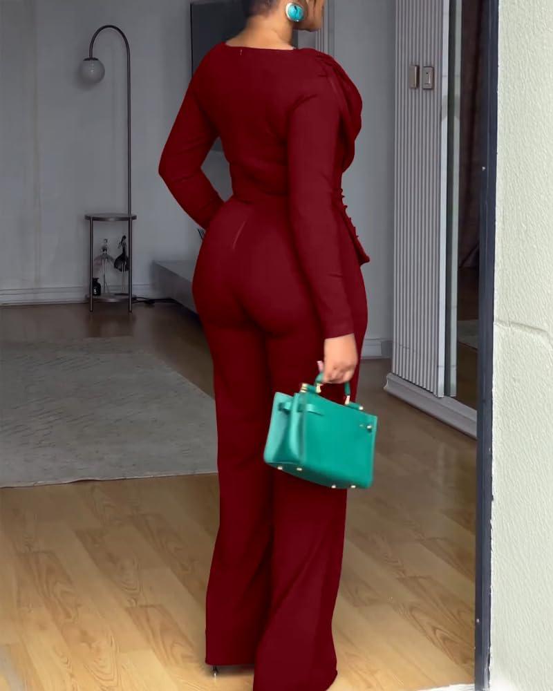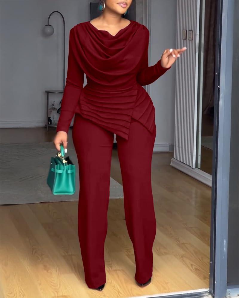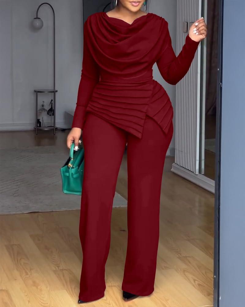 CHICME Women's Fall Jumpsuit Long Sleeve Jumpsuit Dressy Cowl Neck Asymmetrical Hem Overall Zipper Back One Piece Outfit(Red)