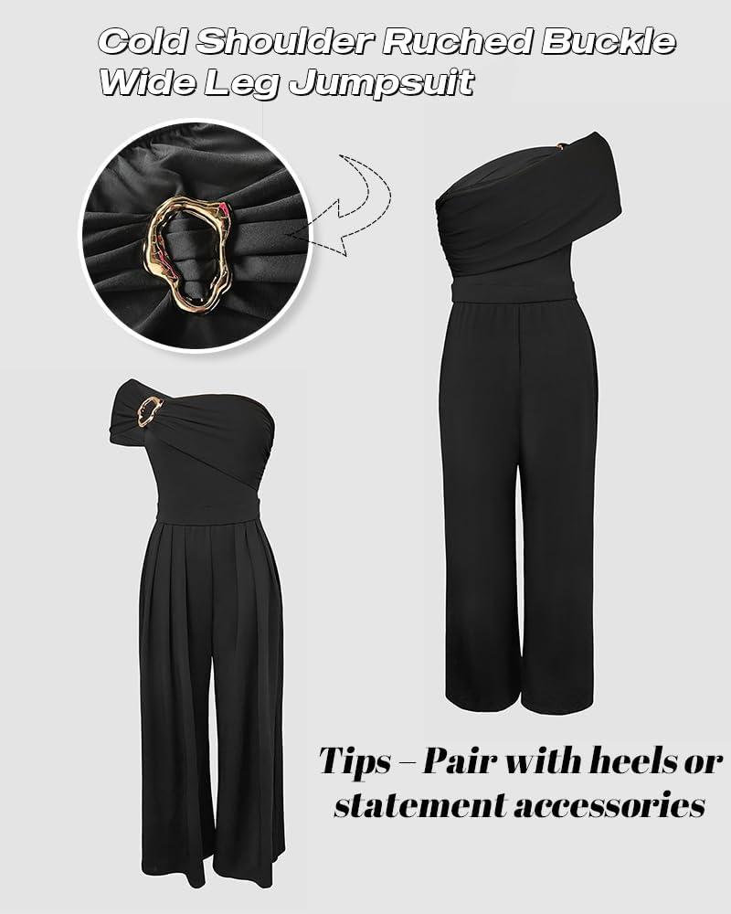CHICME Women's Jumpsuit Dressy One Shoulder Buckle Decor Ruched Wide Leg Jumpsuits Elegant Party Overall(A-black)
