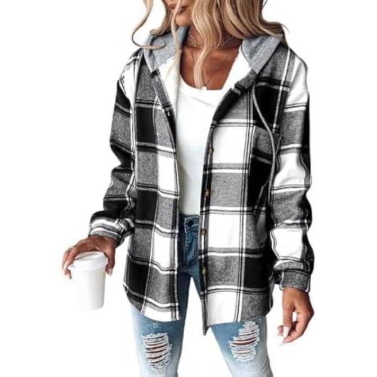 CHICME Womens Lightweight Casual Jacket Plaid Long Sleeve Shacket Fleece Lined Hooded Jackets Warm Coat(Black)