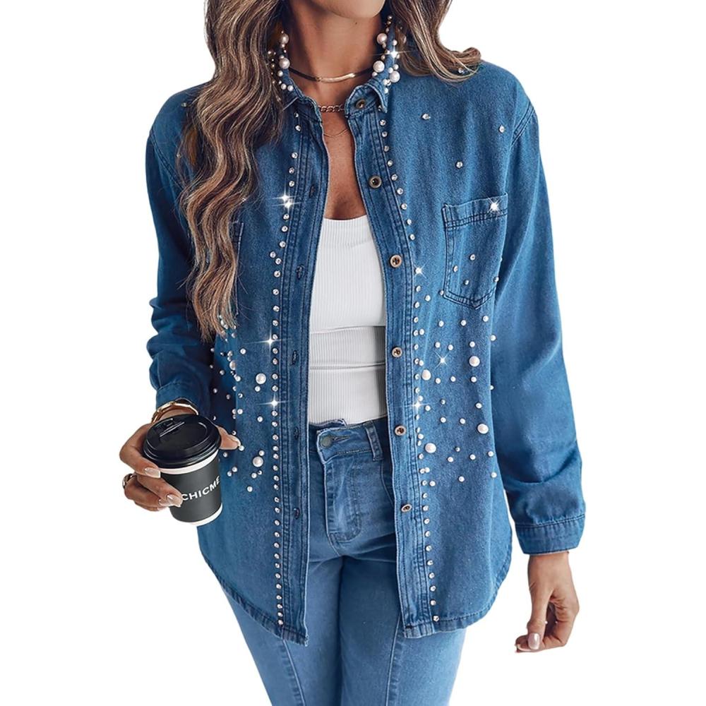 CHICME Womens Pearl Rhinestone Embellished Denim Shirt Long Sleeve Button Down Turn Down Collar Casual Jean(Pearl Rhinestone-blue)