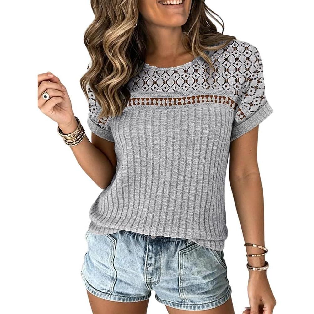 CHICME Womens Short Sleeve Top 2026 Summer Round Neck Ribbed Knit Rolled Cuffs Lace Casual Top(Gray)